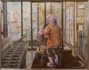 ・外の積雪の様子から、お正月に孫達が会いに来るのかなと想像しました。毎年、義理のお母さんも、みんなの為にご馳走を作って待っていてくれます。丸くて小さい背中が可愛いし、お義母さんの買い出しもこんな感じだなと親しみがわきました。素敵な絵です。